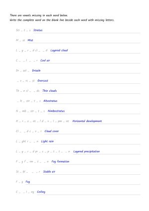 stratus clouds 8 x science vocabulary work sheets plus solutions