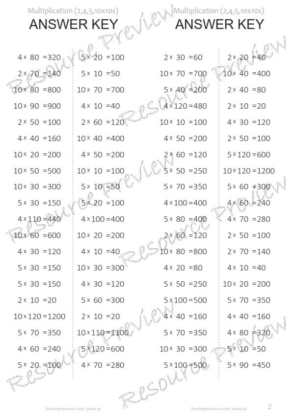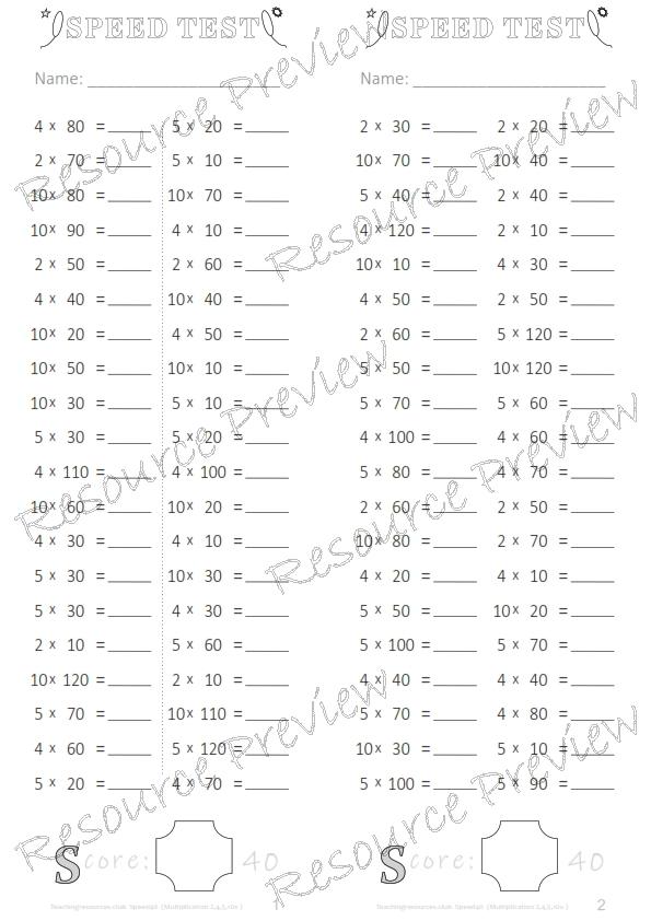2,4,5,.10 x 10s to 120 Multiplication speed test plus answer key