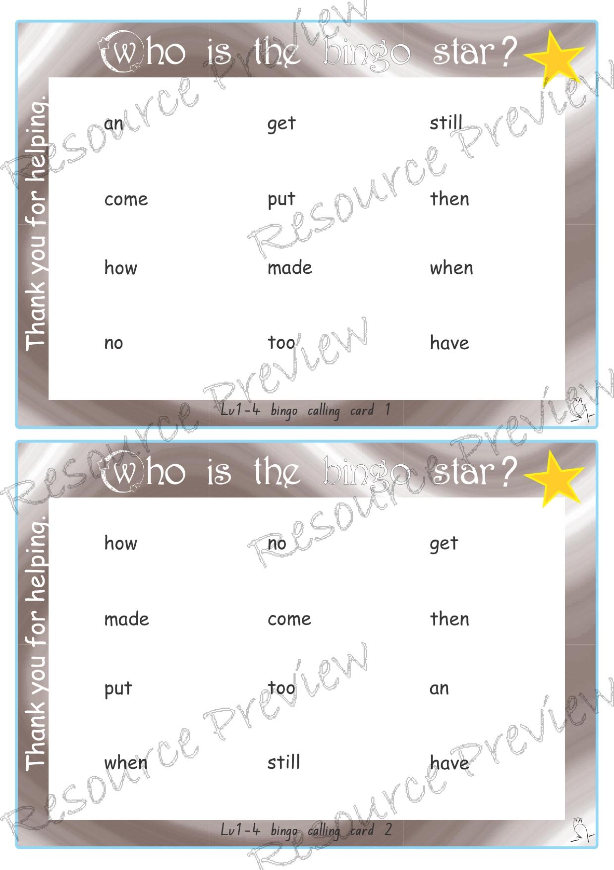 30 cards, student call card, student word lucky dip call sheet, patch covers.